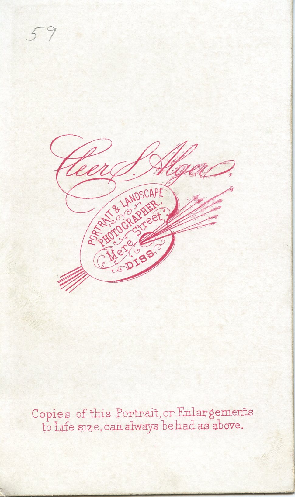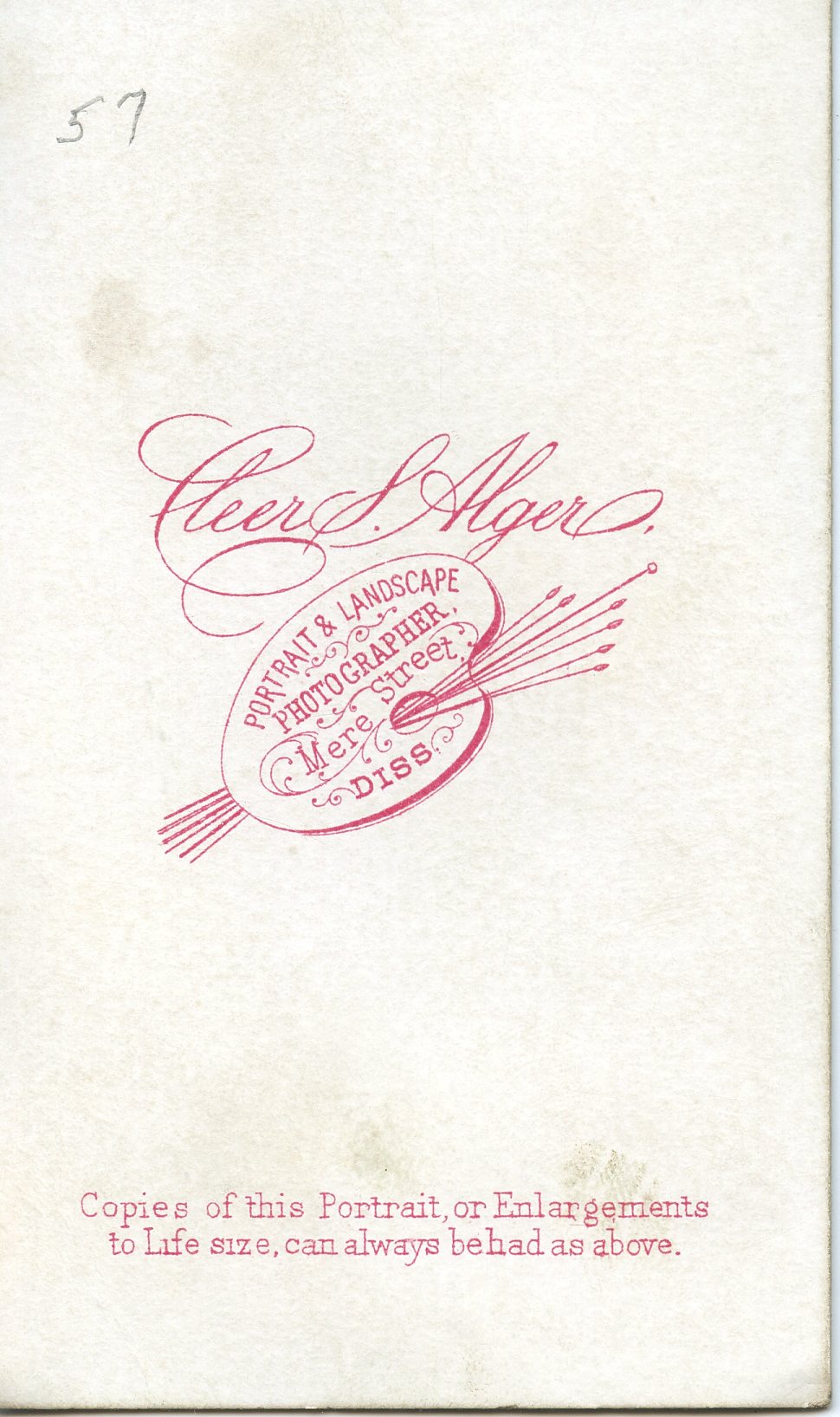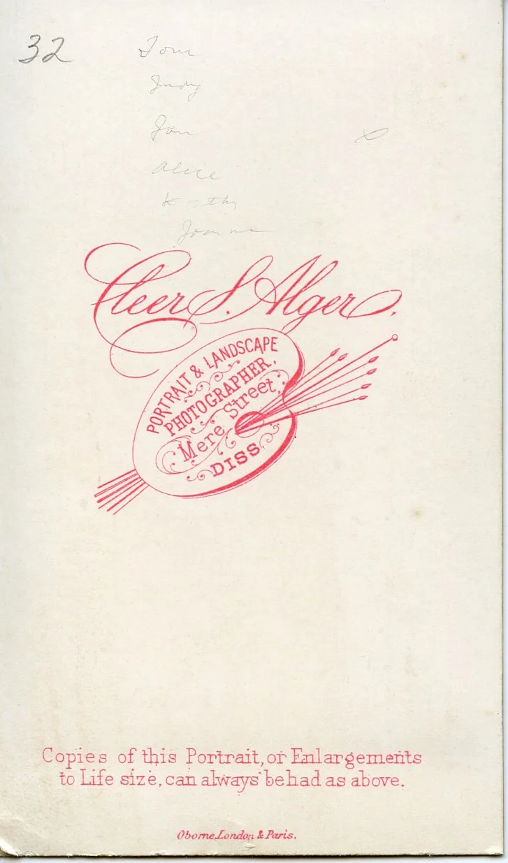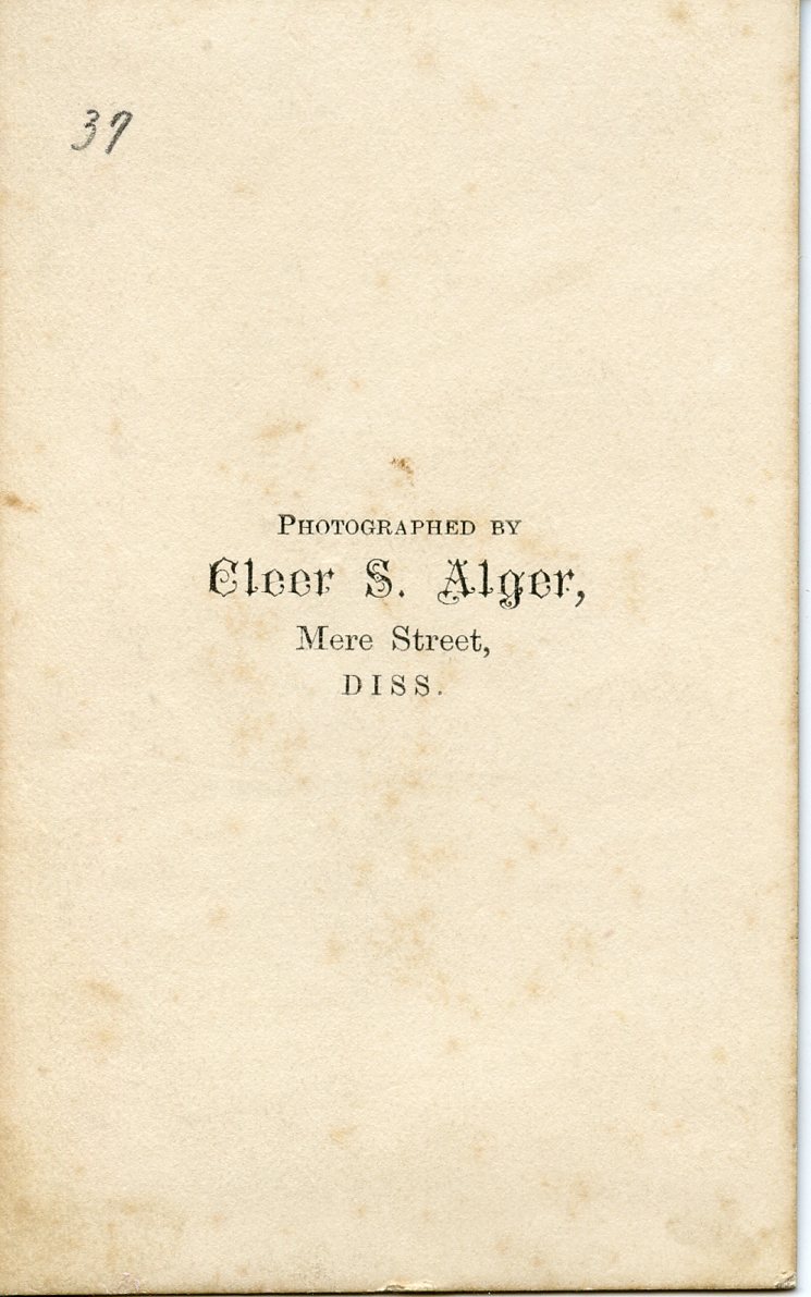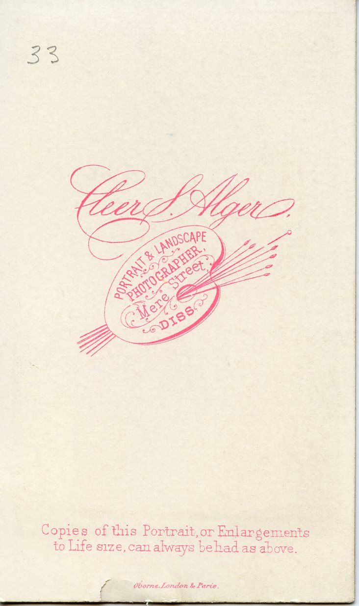 Cleer S. Alger Sr & Jr. took photos from their location on Mere Street in Diss from 1871 - 1904. I thought this could have been William with Margaret & Alice, but in 1861, Margaret would have been 7 so not possible. The simplicity of the logo makes me think its from the 1870s.