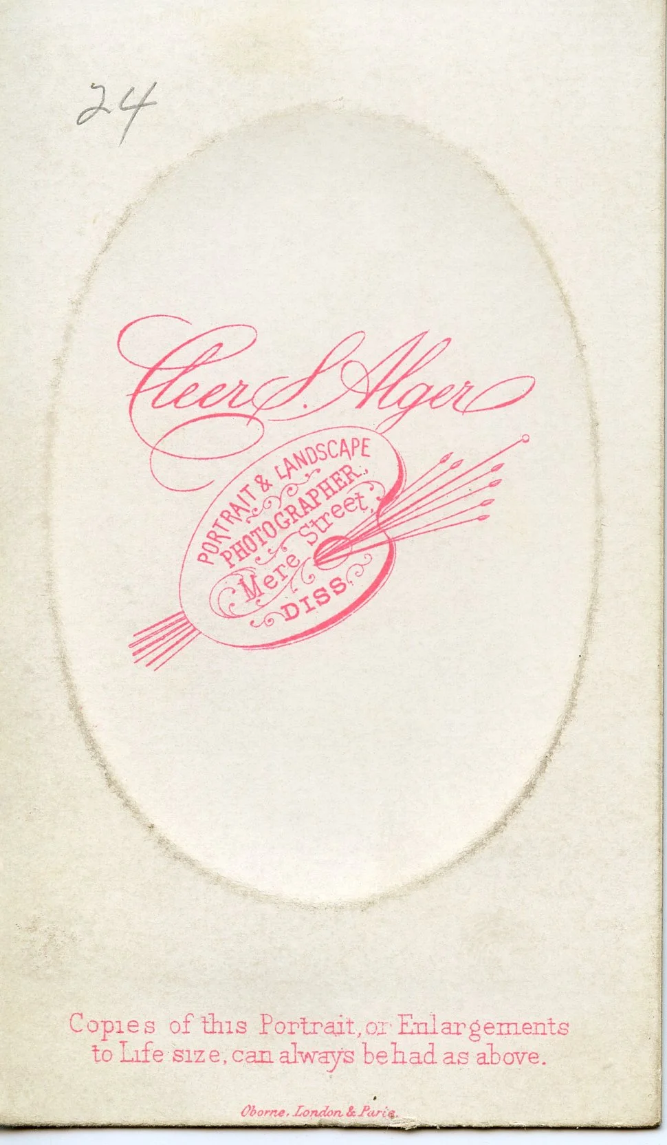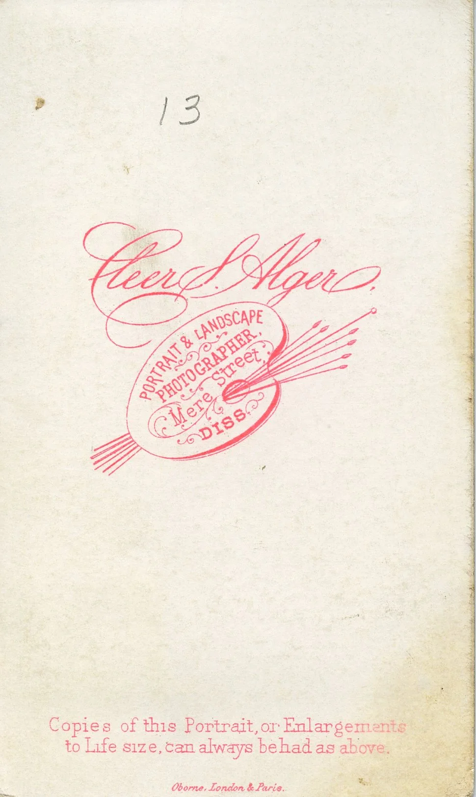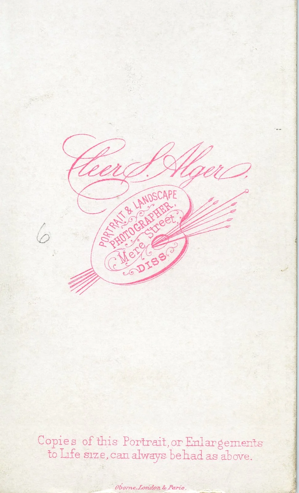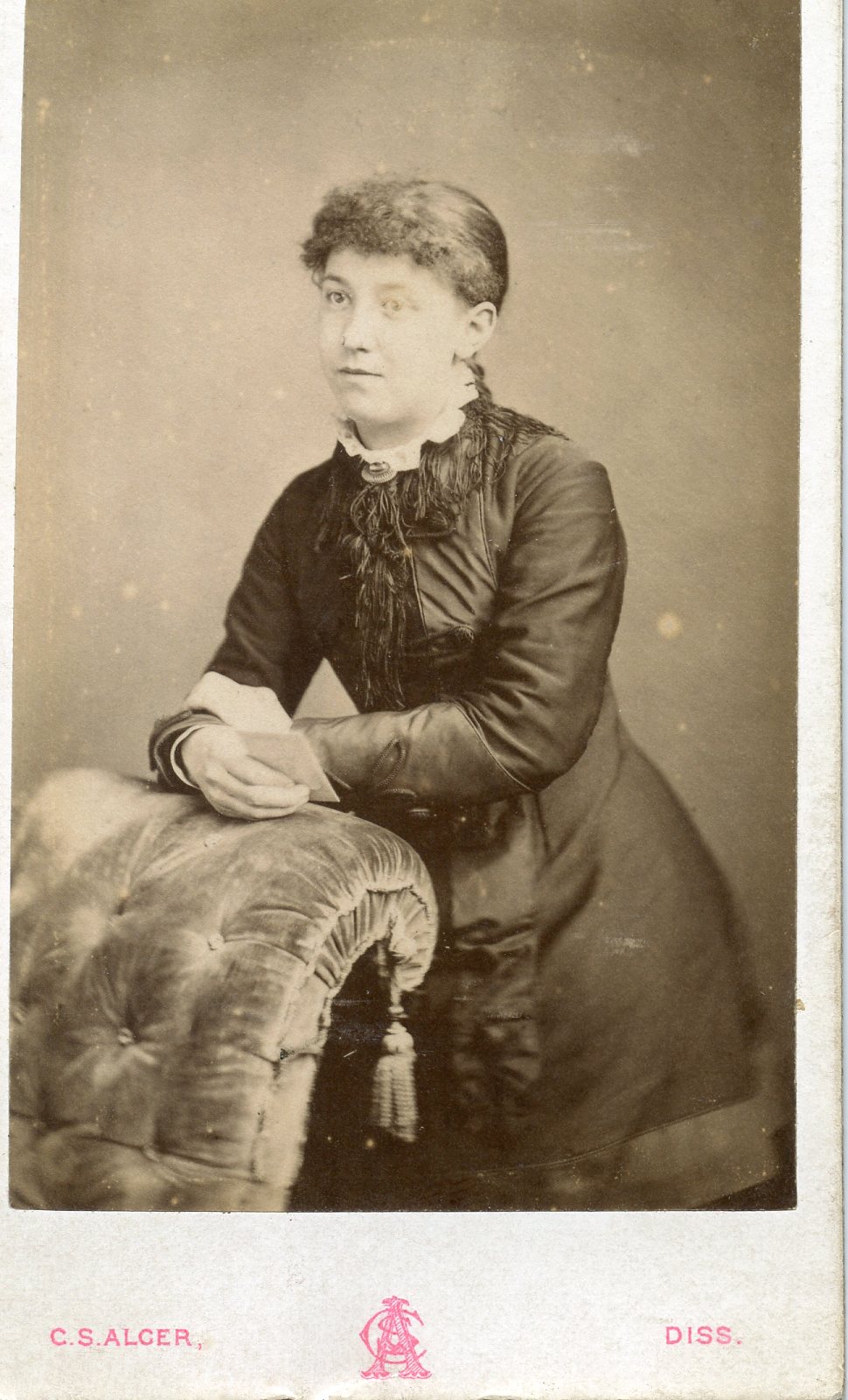 Cleer S. Alger Sr & Jr. took photos from their location on Mere Street in Diss from 1871 - 1904. I thought this could have been William with Margaret & Alice, but in 1861, Margaret would have been 7 so not possible. The simplicity of the logo makes me think its from the 1870s.