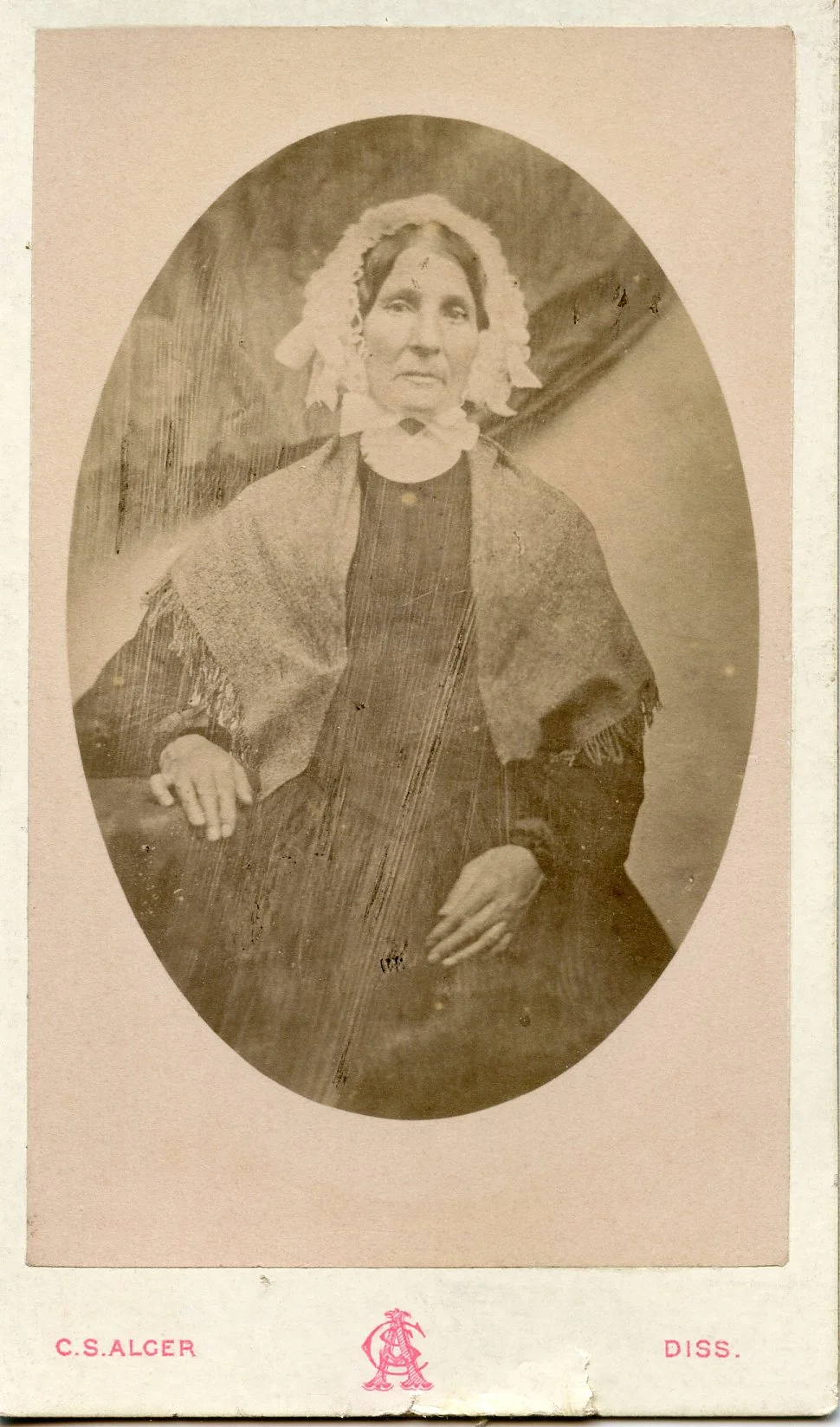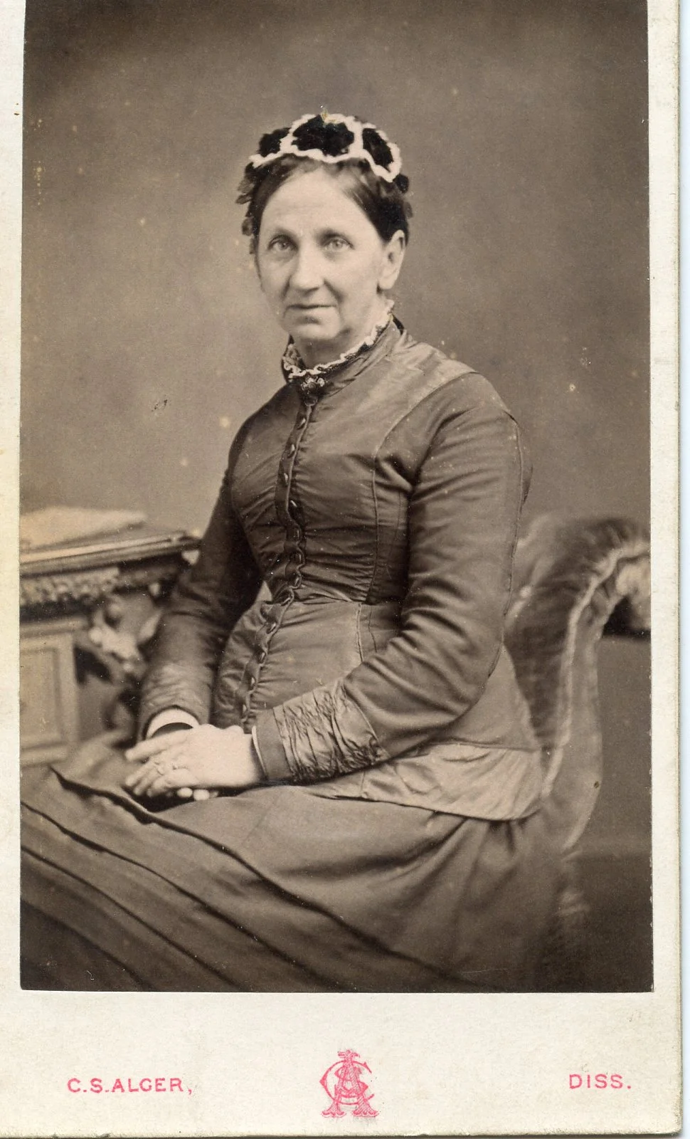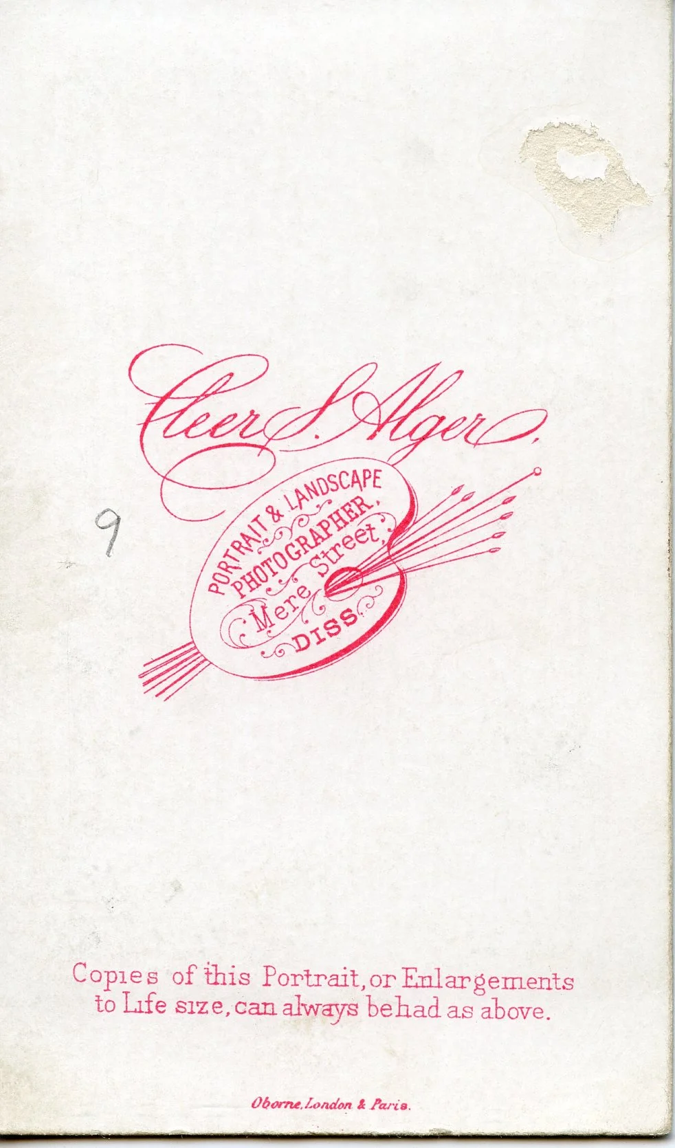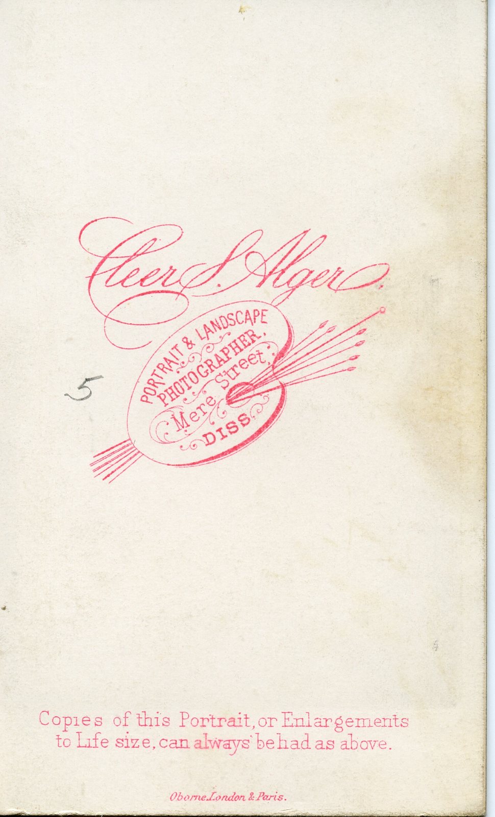 Cleer S. Alger Sr & Jr. took photos from their location on Mere Street in Diss from 1871 - 1904. I thought this could have been William with Margaret & Alice, but in 1861, Margaret would have been 7 so not possible. The simplicity of the logo makes me think its from the 1870s.