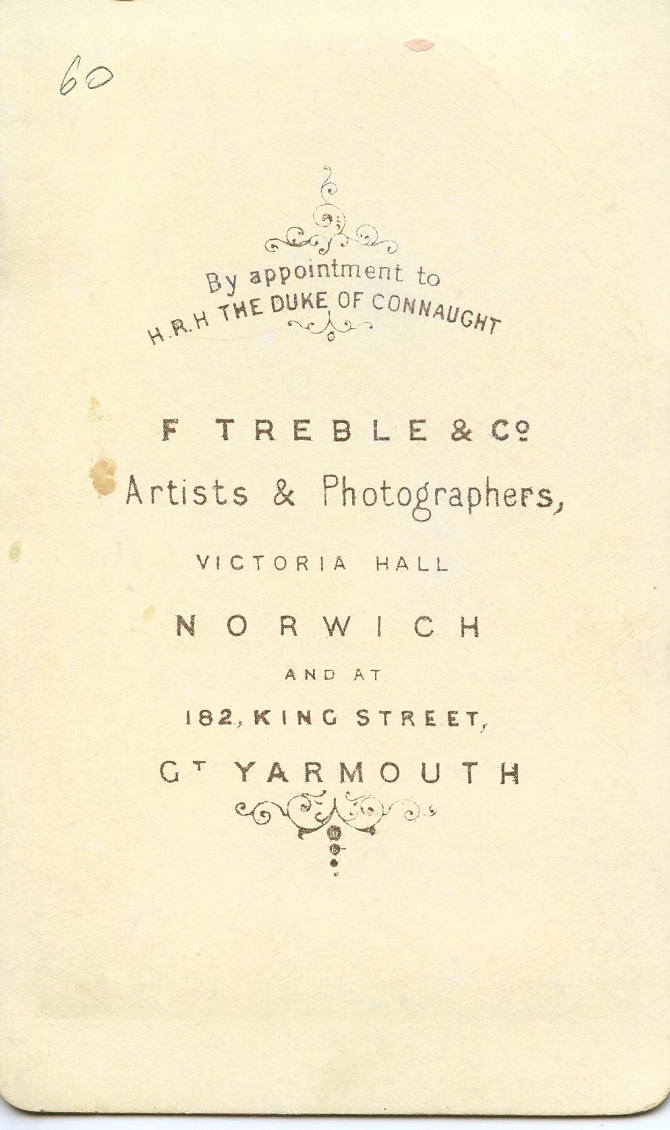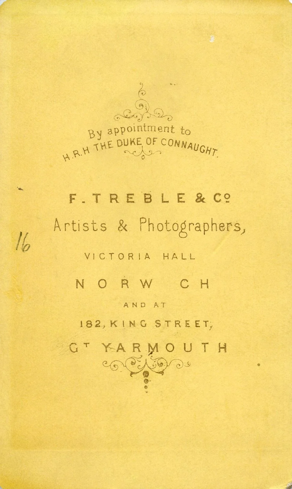 F. Treble & Co 182 King Street & Victoria Hall Norwich - 1879. Also listed as just Frederick Treble at Victoria Hall 1877